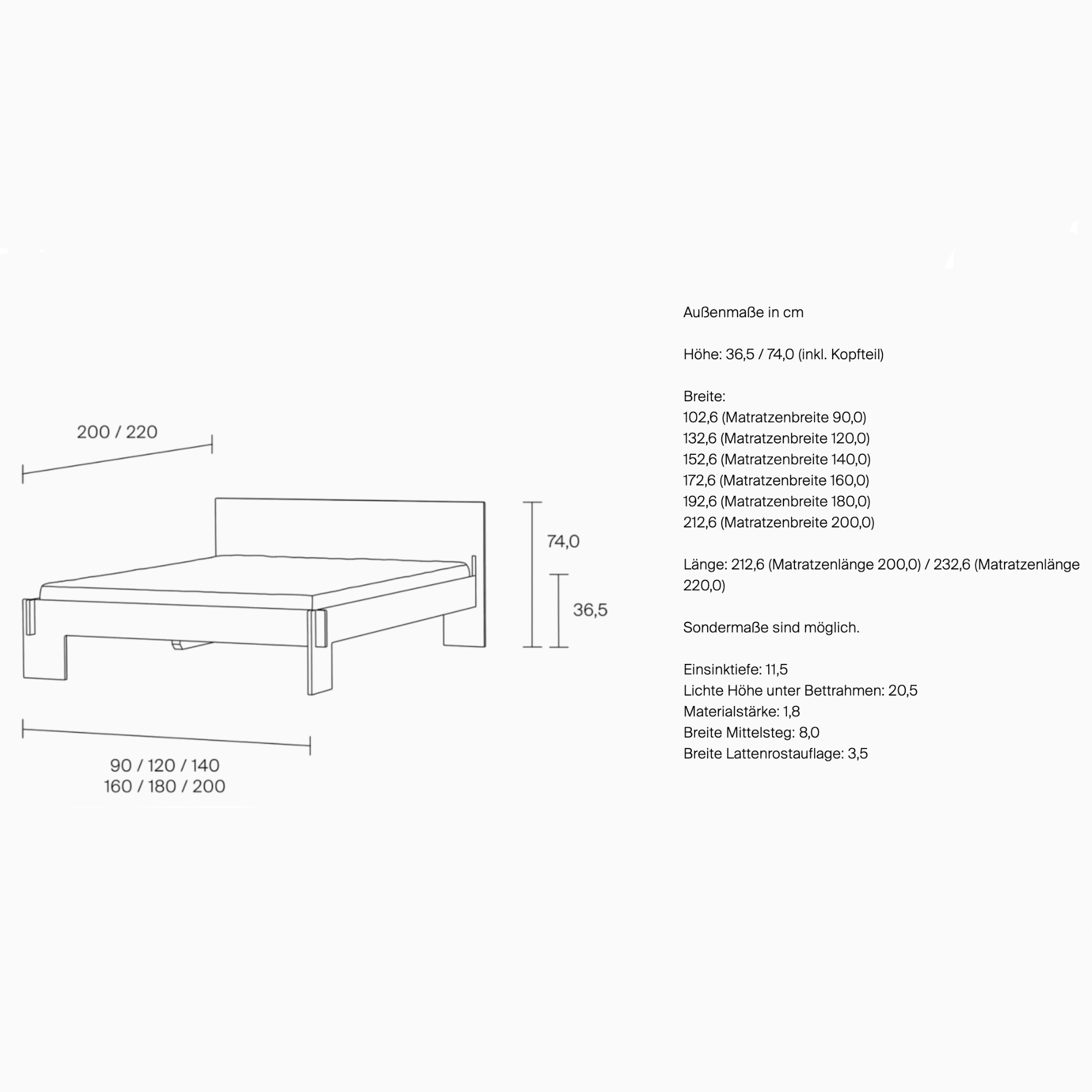 H 36,5 cm, Höhe Kopfteil 74 cm, Höhe zwischen Lattenrost-Auflage und Bettrahmen-Oberkante 11,5 cm,