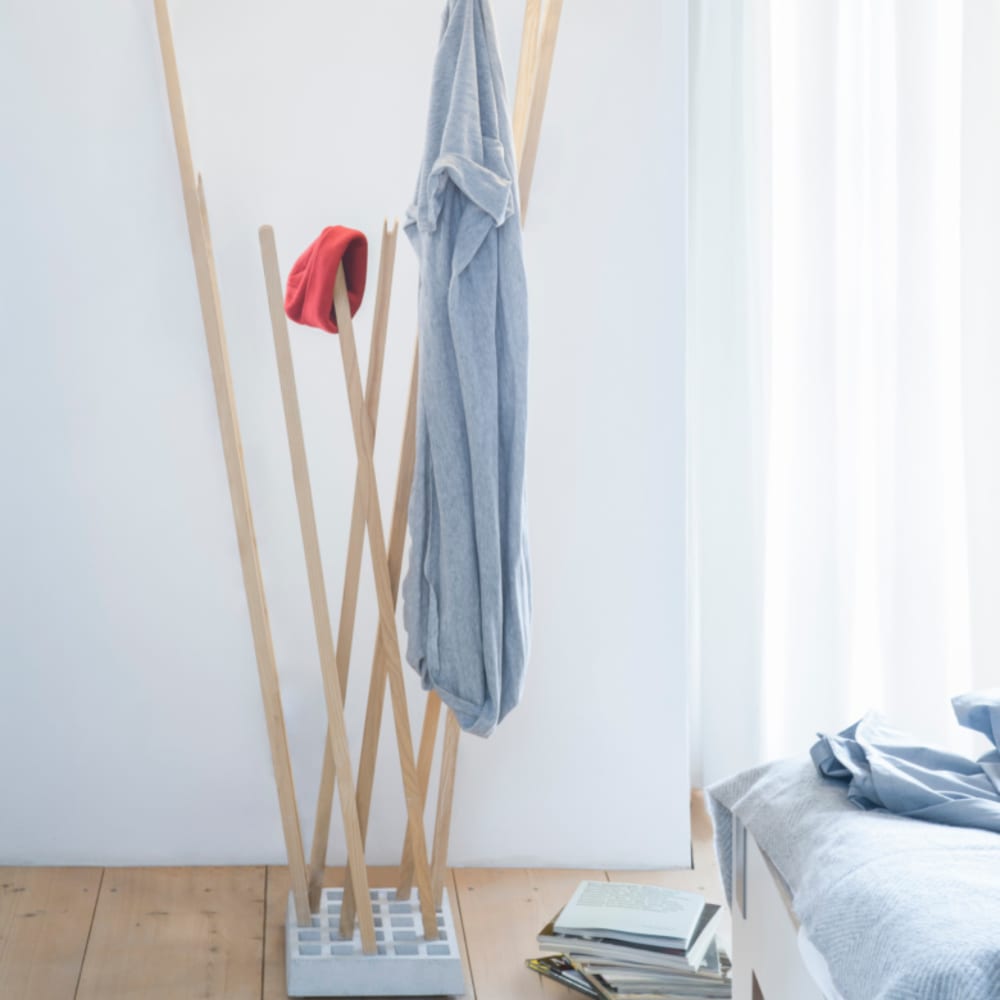Die modulare Garderobe Pin Coat von Moormann wurde von Oliver Bahr entworfen. Bei dieser Garderobe können drei Sets unterschiedlich langer Holzstäbe in einen quadratischen Betonguss-Sockel gesteckt werden. Hierbei dürfen Sie selbst auswählen welche Sets (ein Set besteht aus drei Stäben der selben Länge) Sie miteinander kombinieren möchten. Pin Coat bietet sowohl die Möglichkeit für lässig übergeworfene Kleidung wie auch Kleiderbügel, die an den hakenförmig ausgeformten Stangenenden eingehängt werden können. Aufgrund der verschiedenen Stablängen ist die Garderobe auch für Kinder ebenso gut geeignet. Zusätzlich können auch noch Pin LED Stäbe verwendet werden, die zudem auch noch den Raum erhellen können und für eine interessante Optik sorgen. Da alle Stäbe lose in dem standfesten Betonsockel stecken, können die Pin LED durch Drehen des Stabs ganz einfach von direktem zu indirektem Licht gewechselt werden.