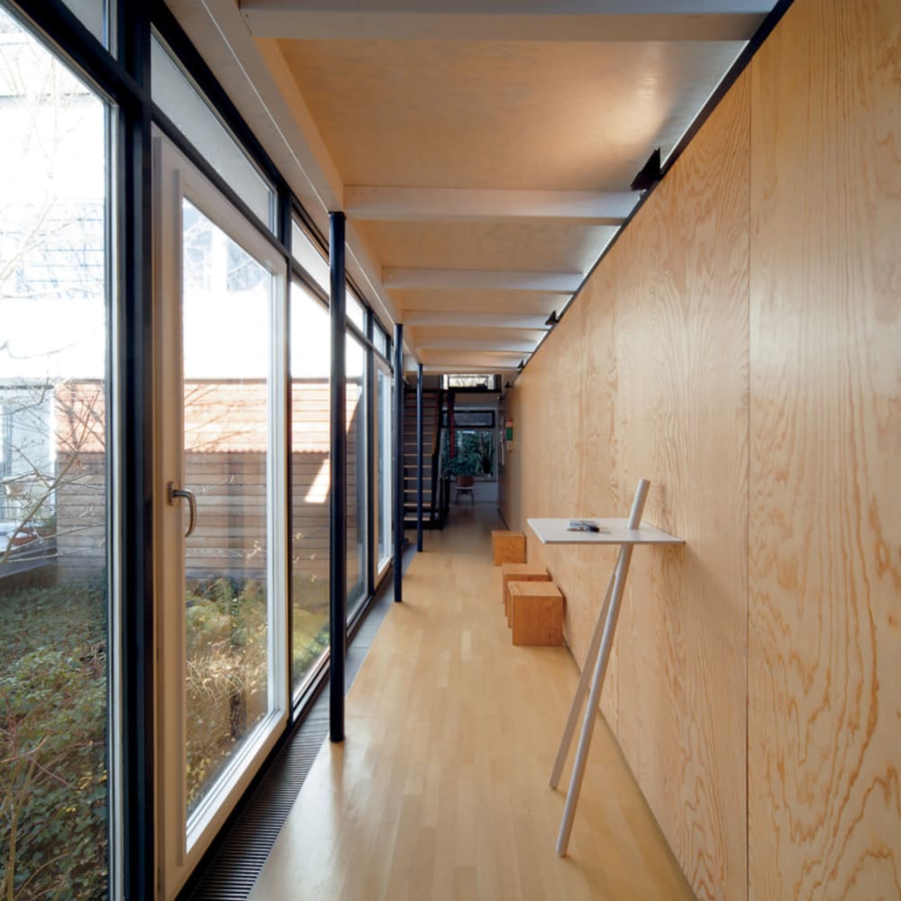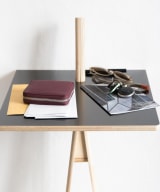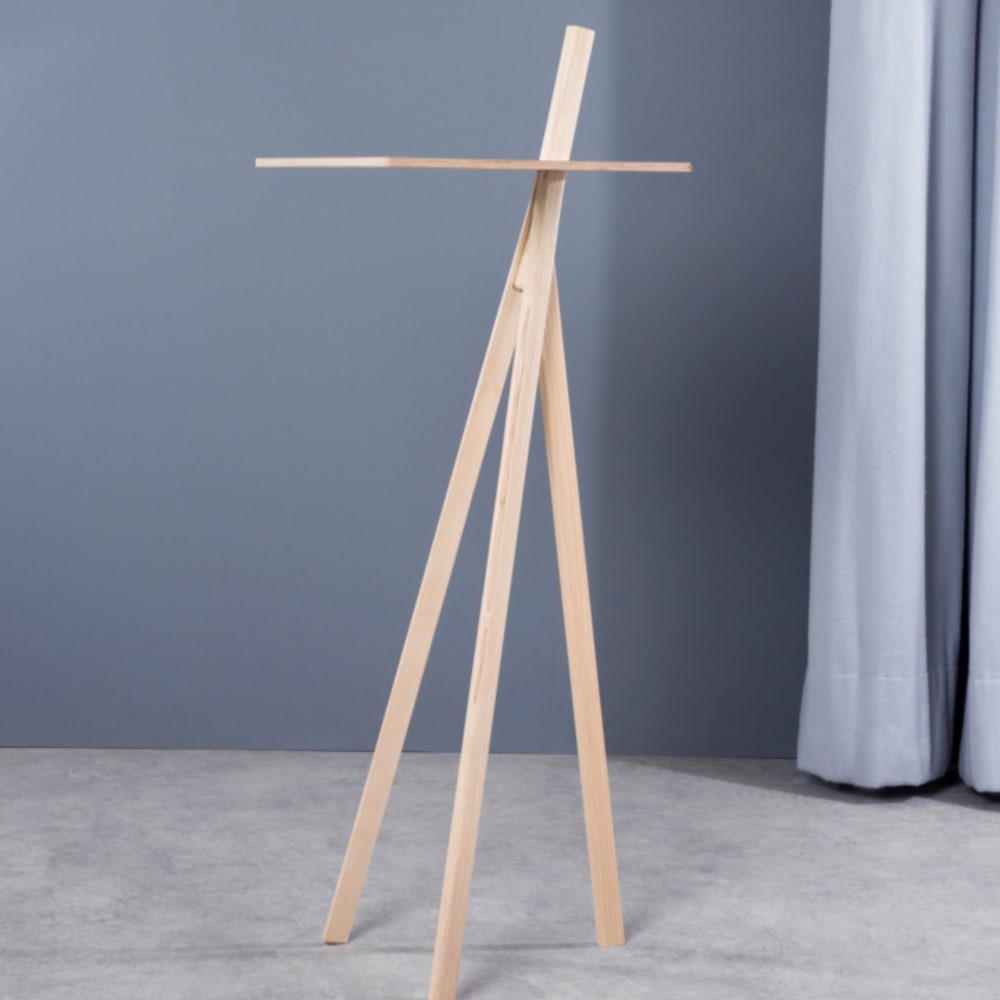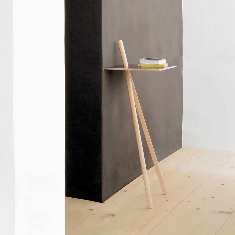 Design Jörg Gätjens, Tischplatte FU (Sperrholz, Birke), Beine Esche unbehandelt, an die Wand gelehnt mit zwei Beinen, freistehend mit drei Beinen, drittes Bein inklusive, max. Belastung 3 kg,