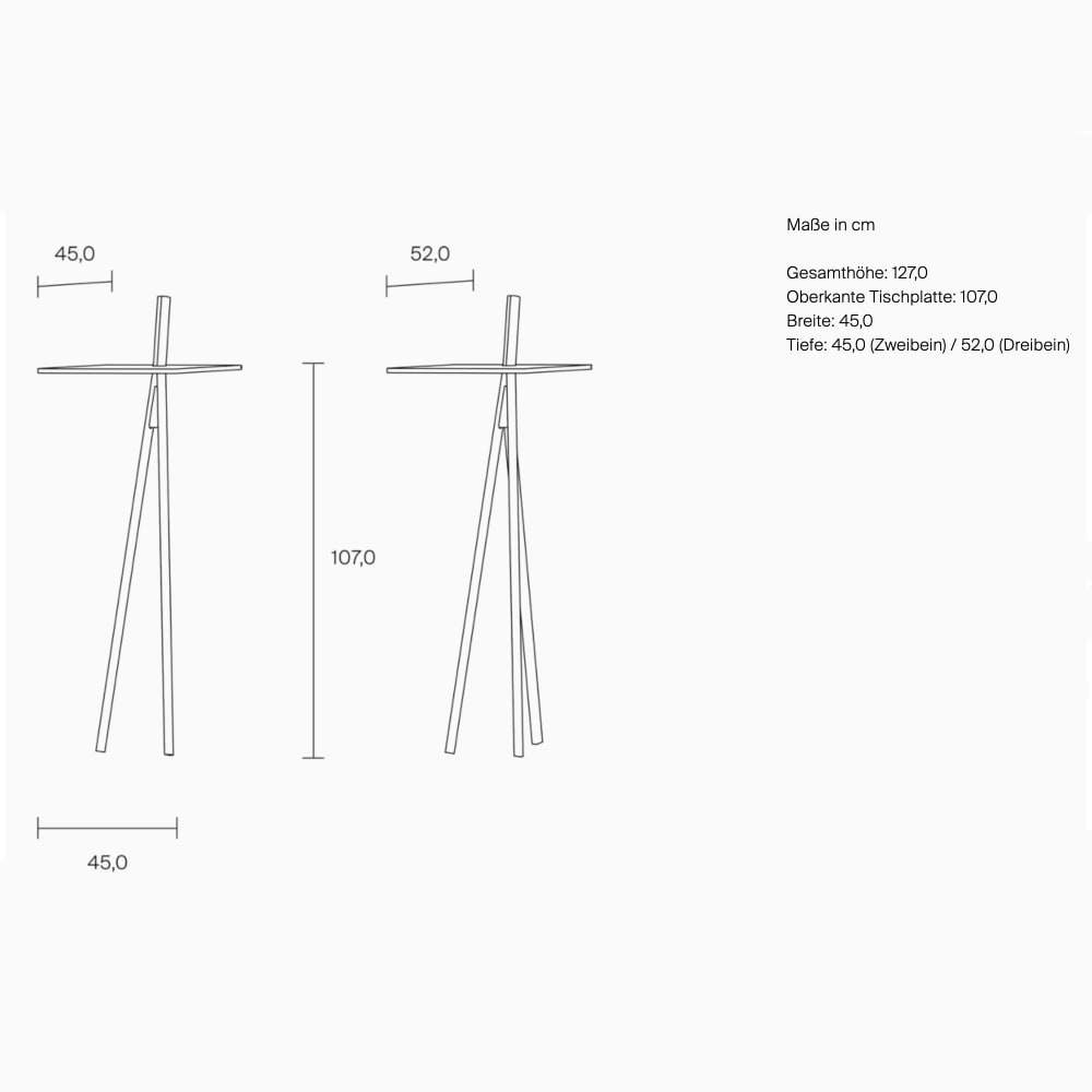 B 45 cm x T 45 cm (2 Beine) / 52 cm (3 Beine) x H 107 cm